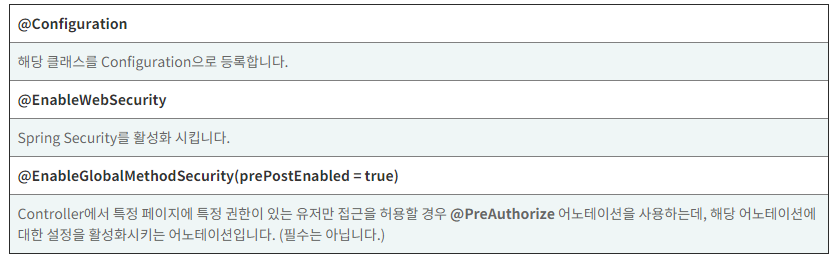 package com.cos.blog.config; import org.springframework.context.annotation.Configuration; import org.springframework.security.config.annotation.method.configuration.EnableGlobalMethodSecurity; import org.springframework.security.config.annotation.web.builders.HttpSecurity; import org.springframework.security.config.annotation.web.configuration.EnableWebSecurity; import org.springframework.security.config.annotation.web.configuration.WebSecurityConfigurerAdapter; import org.springframework.security.config.annotation.web.servlet.configuration.EnableWebMvcSecurity; @Configuration // 빈 등록 (객체 생성) @EnableWebSecurity // 필터 체인에 등록 (스프링 시큐리티 활성화) @EnableGlobalMethodSecurity(prePostEnabled=true) // 특정 주소 접근시 권한 및 인증을 pre(미리) 체크하겠다. public class SecurityConfig extends WebSecurityConfigurerAdapter{ @Override protected void configure(HttpSecurity http) throws Exception { http .authorizeRequests() .antMatchers("/auth/loginForm", "/auth/joinForm") .permitAll() .anyRequest().authenticated() .and() .formLogin().loginPage("/auth/loginForm"); } }